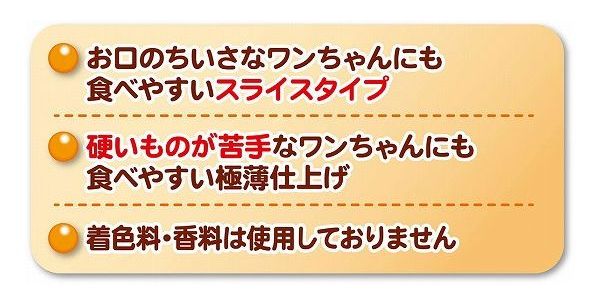 食物センイやビタミンC・Eを含むさつまいもを蒸してから乾燥しているので、糖度がUPし甘みが濃縮されています。そのままでも与えやすいスライスタイプで、硬いものが苦手なワンちゃんにも食べやすい。着色料・香料無添加。