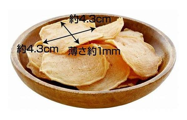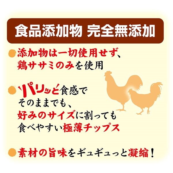 食品添加物は一切使用せず、良質たん白質豊富な鶏ササミを100%使用しました。パリッと食感でそのままでも、好みのサイズに割っても食べやすい極薄仕上げのササミチップス。穀物不使用なので、穀物アレルギーのワンちゃんにも安心。農林水産省認定 鳥加熱処理工場製造。