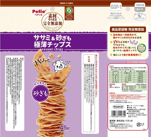 【8個セット】 ペティオ 素材そのまま 完全無添加 ササミ&砂ぎも パリッと 極薄チップス 45g【ポイント10倍】 【送料無料】