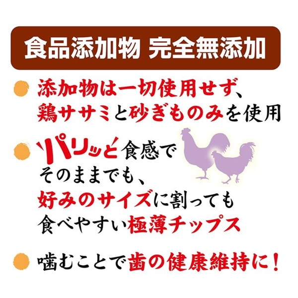 食品添加物完全無添加、鶏ササミと砂ぎものみを使用しました。パリッと食感でそのままでも、好みのサイズに割っても食べやすい極薄チップス。
