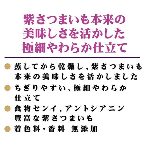紫さつまいもだけを使用し、素材本来の美味しさを引き立てました。ちぎりやすい、極細やわらか仕立てです。