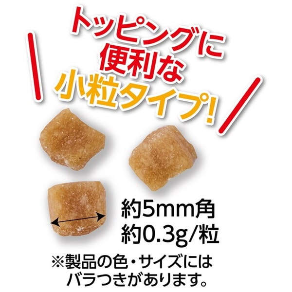 肉類(鶏・鶏レバー)、小麦粉、糖類、とうもろこし、大豆たん白、おから、小麦たん白、オリゴ糖、コラーゲン、地鶏エキス、サメ軟骨抽出物(コンドロイチン含有)、N-アセチルグルコサミン、酵母、乳酸菌(KH-2株(熱処理済み))、かぼちゃ、プロピレングリコール、ミネラル類(リン・カルシウム・ナトリウム・塩素・亜鉛・銅・ヨウ素・コバルト)、ソルビトール、メチオニン、保存料(ソルビン酸K、デヒドロ酢酸Na)、ポリリン酸Na、ビタミン類(A・B2・B12・D・E・コリン・パントテン酸)、リノレン酸