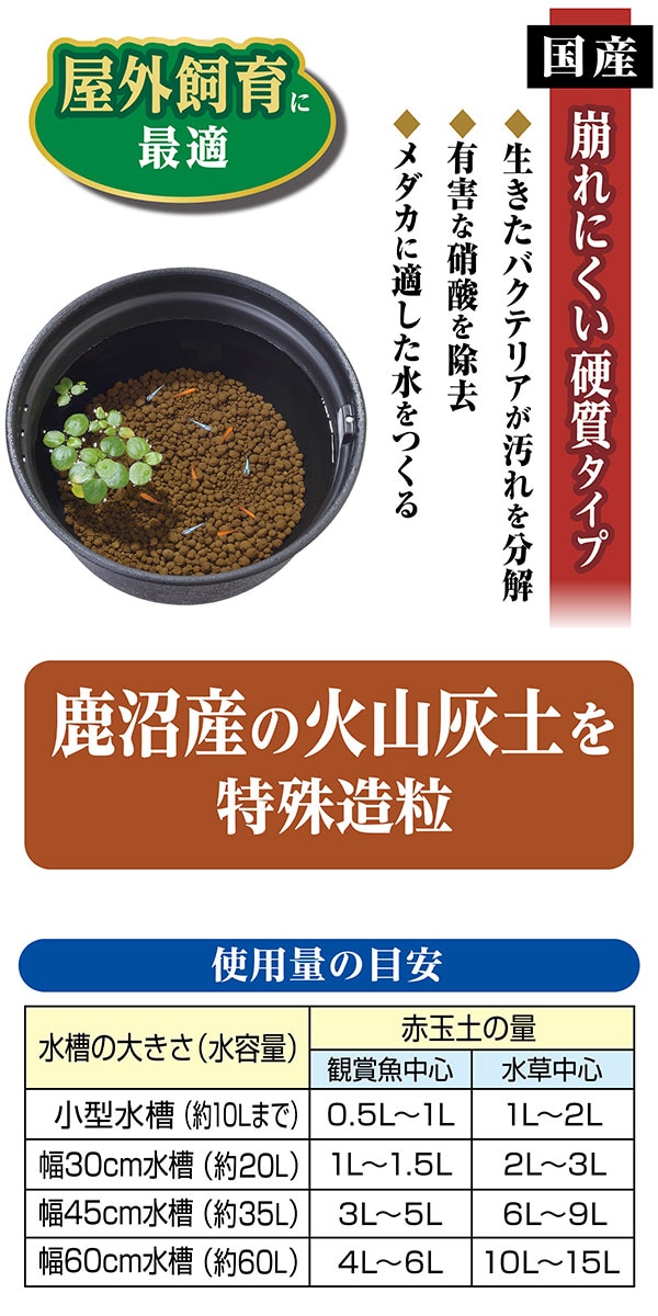 ・鹿沼産の火山灰土を硬質造粒し、生きたバクテリアを配合。メダカに適した水を作ることができるメダカ専用の赤玉土です。