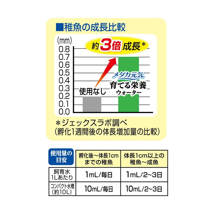 メダカは太陽光を浴びることで成長に必要なビタミンの一部を体内で合成します。本製品は、餌からは摂取しにくく、室内飼育や日照不足で十分な太陽光を浴びることのできないメダカに不足しがちなビタミンB3・B6・パントテン酸と各種ミネラル類を配合した、成長用栄養ウォーターです。未使用時と比較して約3倍成長(メーカー調べ)!