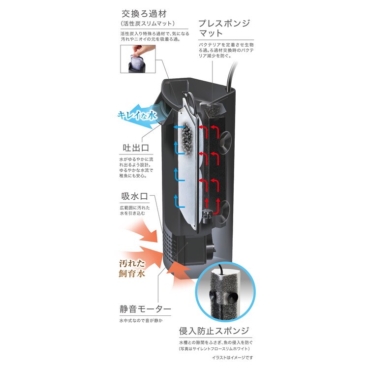 活性炭マット+プレスポンジマットを搭載した密閉タイプのろ過方式を採用。ろ過材との接触面が広く、高いろ過能力を実現!