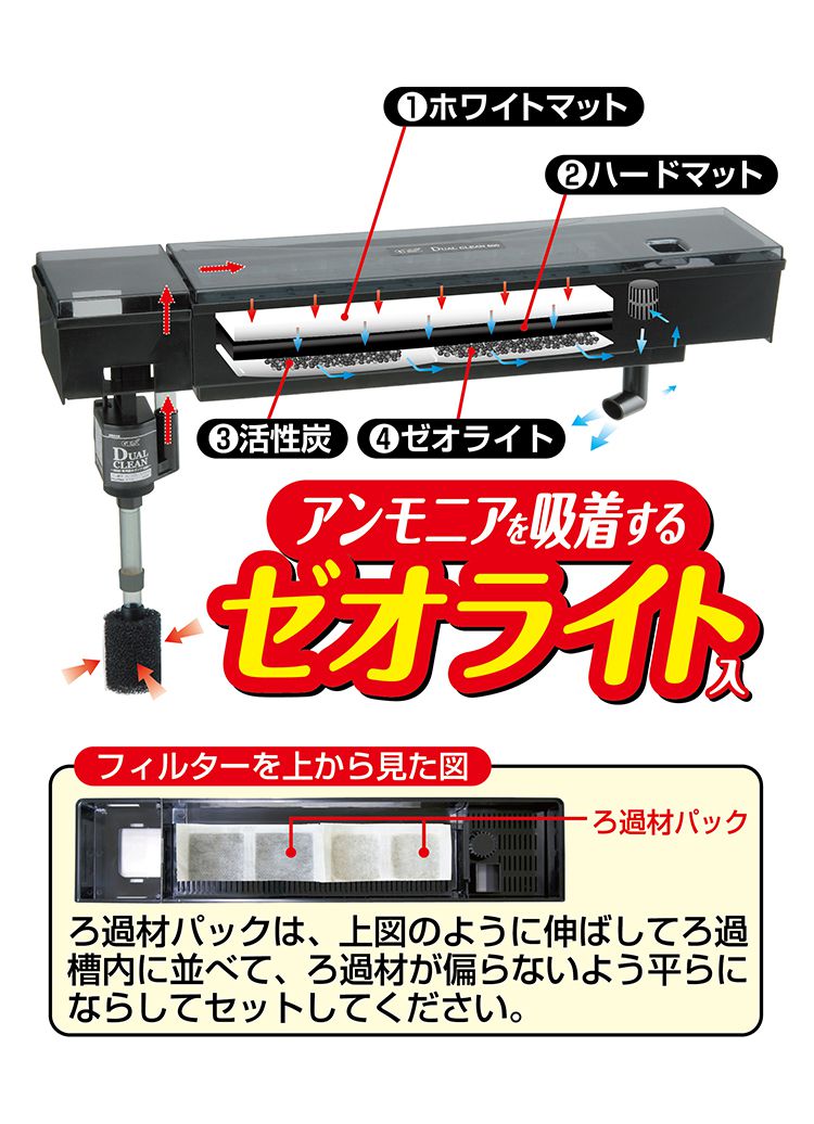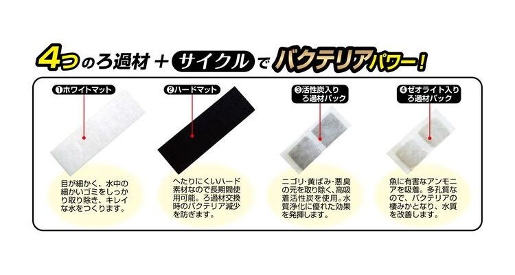 ホワイトマット、ハードマット、活性炭入りろ過材パック、ゼオライト入りろ過材パックの4つのろ過材+生きたろ過バクテリア「サイクル」1回分が付いた上部フィルター用ろ過マットです。