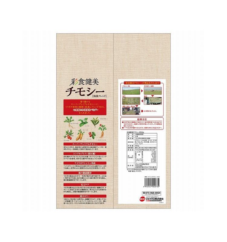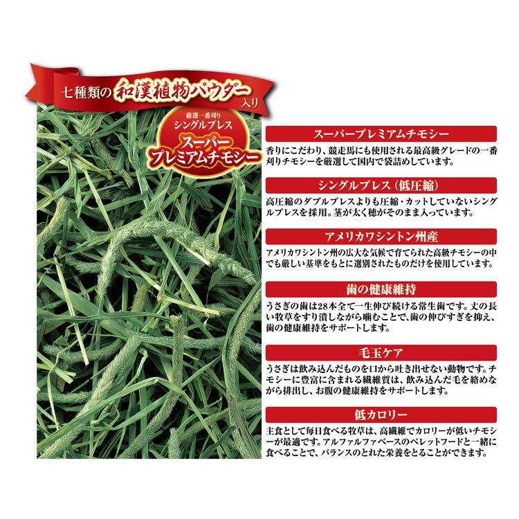 一番刈りの香り豊かなスーパープレミアムチモシーに、うさぎの食性と健康に配慮しブレンドされた七種類の和漢植物パウダー(タンポポの根・ハコベ・枇杷の葉・クコの葉・サンヤク・ナツメ・オタネニンジン)を入れました。