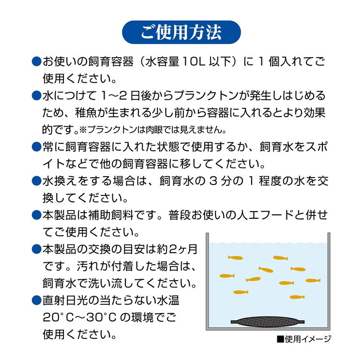 ・針子はヨークサックから栄養をとった後、餌不足により餓死することがあります。本製品は飼育容器に入れておくだけで、孵化後1~2週間までの針子が食べられるブランクトンを発生させ、いつでも生きた餌をあげることができるので、針子をしっかりと育てることができます。また、生きた餌なので飼育水の汚れによる水質悪化を抑えます。