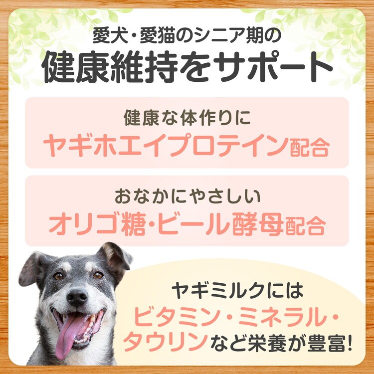 おいしさはそのままで、中高齢期の愛犬・愛猫に必要な成分をプラスしたゴートミルク。ヤギホエイプロテイン配合で健康な筋肉の維持を、オリゴ糖・ビール酵母配合でおなかの健康維持をサポートします。保存料、着色料は一切使用しておりません。ヤギミルクにはカルシウム、ビタミン、ミネラル、マグネシウム、カリウム等が豊富に含まれ、命の源といわれるタウリンの含有率は牛乳の約20倍に及びます。また、ヤギミルクは良質なたんぱく質源であり中鎖脂肪酸も含まれています。脂肪球が牛乳の約1/6である為、牛乳に比べて消化しやすく、母乳に最も近いと言われています。お水で溶かしてミルクとして与えれば、お水を飲まない子の水分補給もできます。フードに混ぜたり、ふりかけとして与えるのもおすすめです。