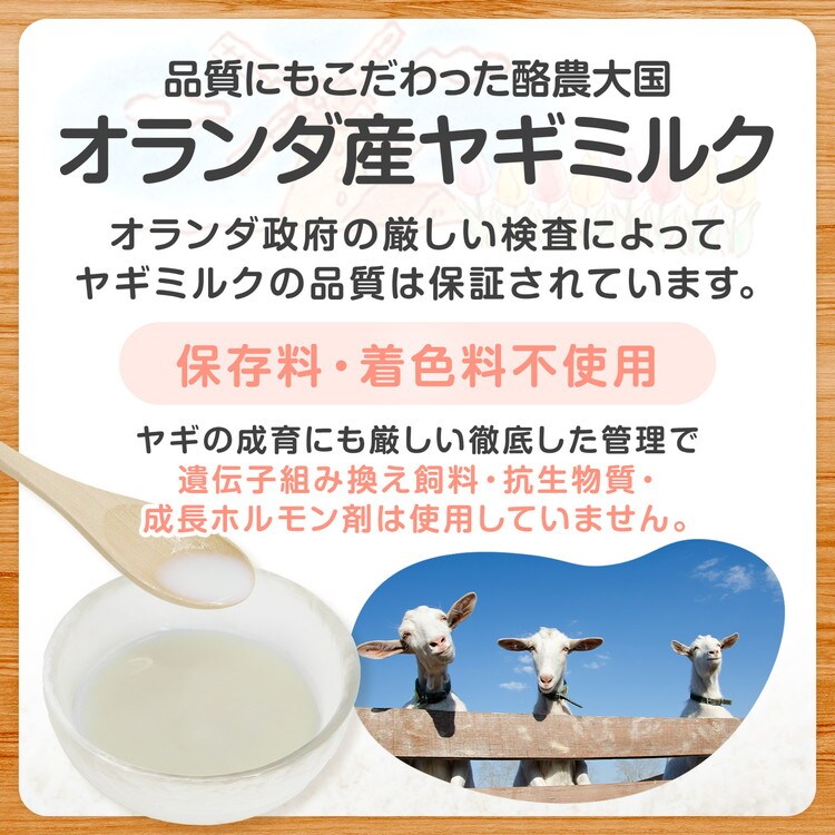 ヤギミルク粉末(オランダ)、ヤギホエイプロテイン(オランダ)、オリゴ糖(日本)、ビール酵母(リトアニア)