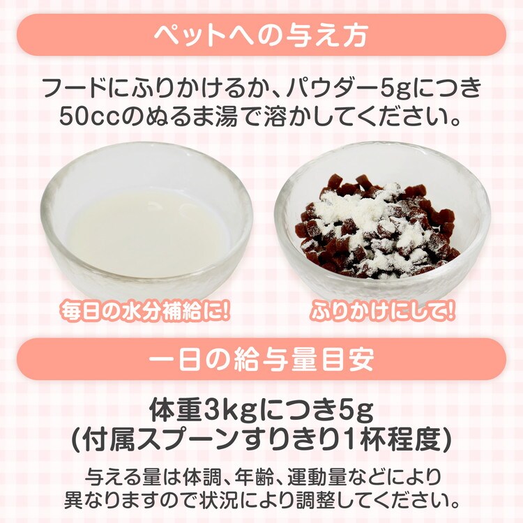 フードにふりかけるか、パウダー5gにつき50ccのぬるま湯で溶かしてください。