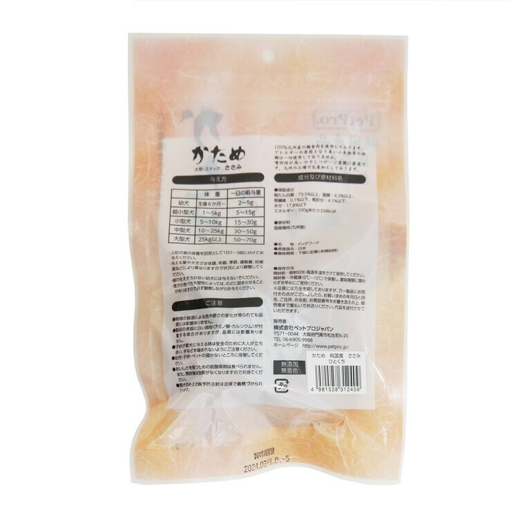 着色料・保存料・酸化防止剤不使用。100%九州産の鶏食肉を使用しています。小麦粉等の粉類は不使用のグルテンフリーのおやつ。九州の工場で生産加工しております。嗜好性が高いのでしつけ・ご褒美に最適です。