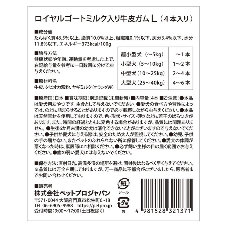 【12個セット】 ペットプロ ロイヤルゴートミルク入り牛皮ガムL 4本入り【送料無料】