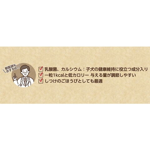 国産で与えやすい小粒サイズのボーロです。1粒あたりのカロリー1kcal以下なので、罪悪感なく与えられるおやつ。わんちゃんの健康をサポートする乳酸菌を約110億個配合(1パックあたり)。パピーだけではなく超小型犬にもおすすめです。嗜好性が高くトイレのしつけなどのご褒美としても使用できます。