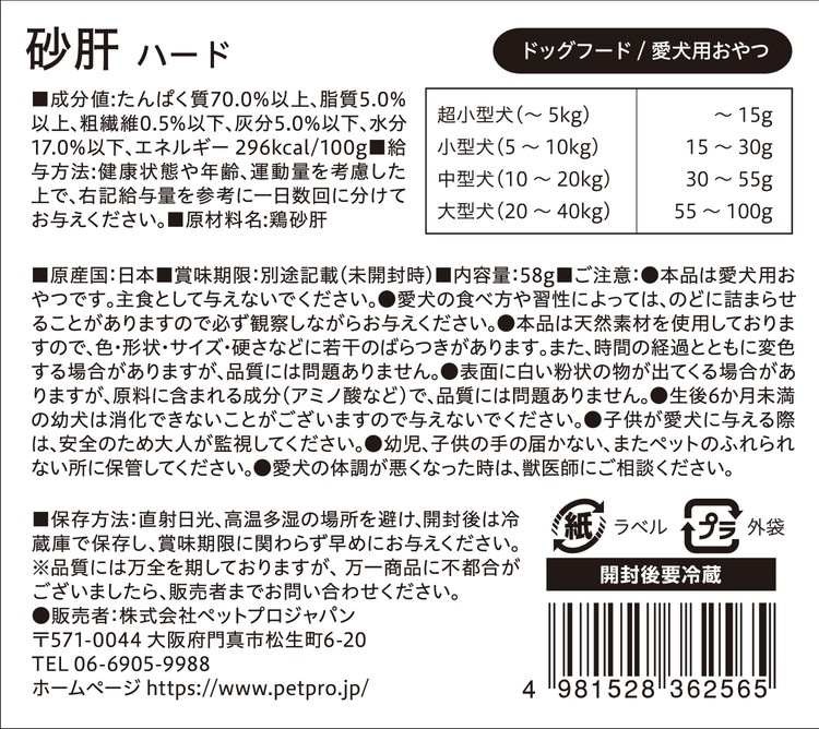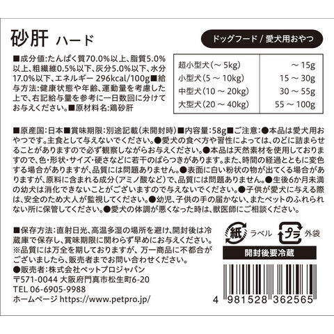 【3個セット】 ペットプロ 国産おやつ 砂肝ハード 58g 国産 日本製 犬用 犬 おやつ スナック ジャーキー 砂肝【ポイント10倍】