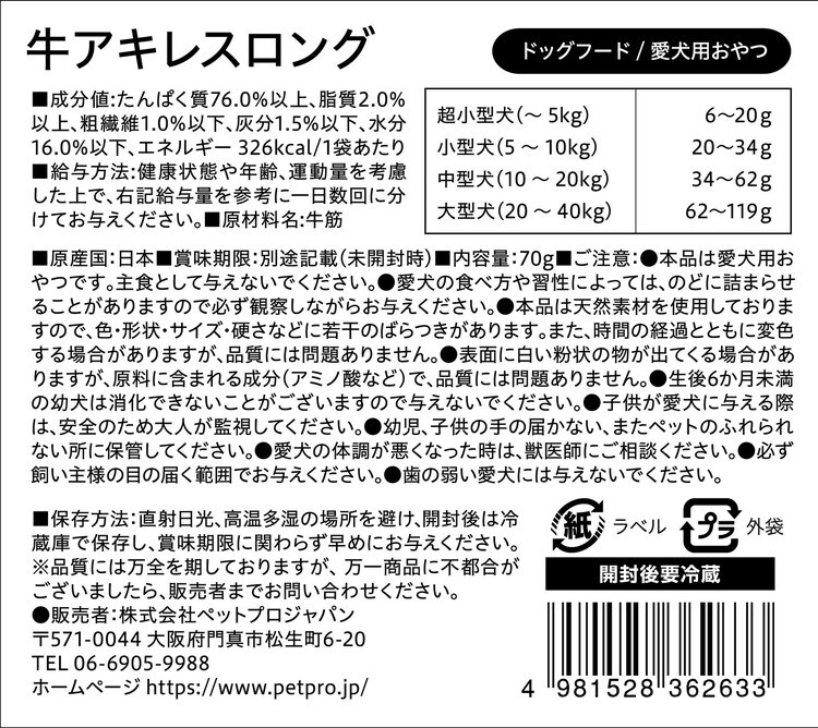 【2個セット】 ペットプロ 国産おやつ 牛アキレスロング 70g 国産 日本製 犬用 犬 おやつ スナック ジャーキー アキレス 牛【ポイント10倍】 【送料無料】のレビュー