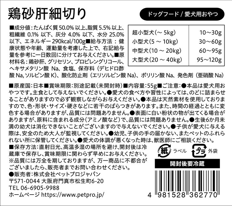 【6個セット】 ペットプロ 国産おやつ 鶏砂肝細切り 55g 国産 日本製 犬用 犬 おやつ スナック ジャーキー 砂肝【ポイント10倍】 【送料無料】