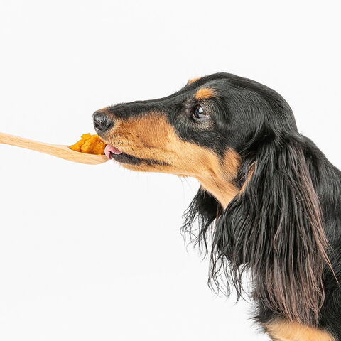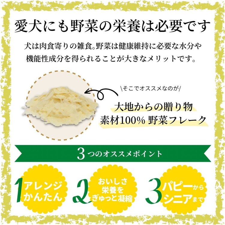 与え方:一日数回普段の食事にトッピングして与えてください(目安:大さじ1杯1.7g)。ペーストにする場合、本品とぬるま湯を1対5の割合でとろみがつくまでよく混ぜ、冷ましてから与えてください。愛犬の年齢、運動量などを考慮し、最初は便の様子など健康状態をみながら与えてください。