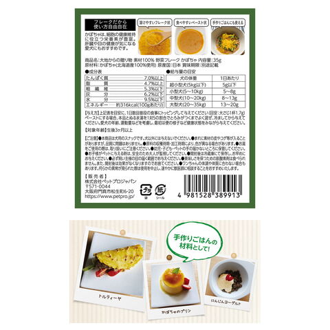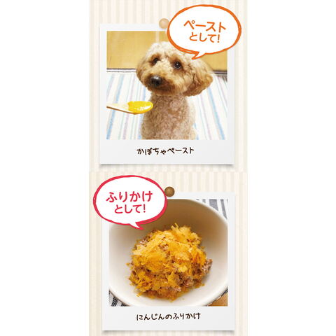 安心安全な国産(北海道産)100%のかぼちゃを素材のうまみと栄養そのままフレークにしました。かぼちゃは抗酸化作用のあるβカロテン、ビタミンC、ビタミンEが豊富で、肝臓や目の健康が気になる愛犬にもおすすめです。ふりかけとしていつものごはんにトッピングして、食べやすいペースト状にして、手作りごはんに、おやつになど使い方自由自在。