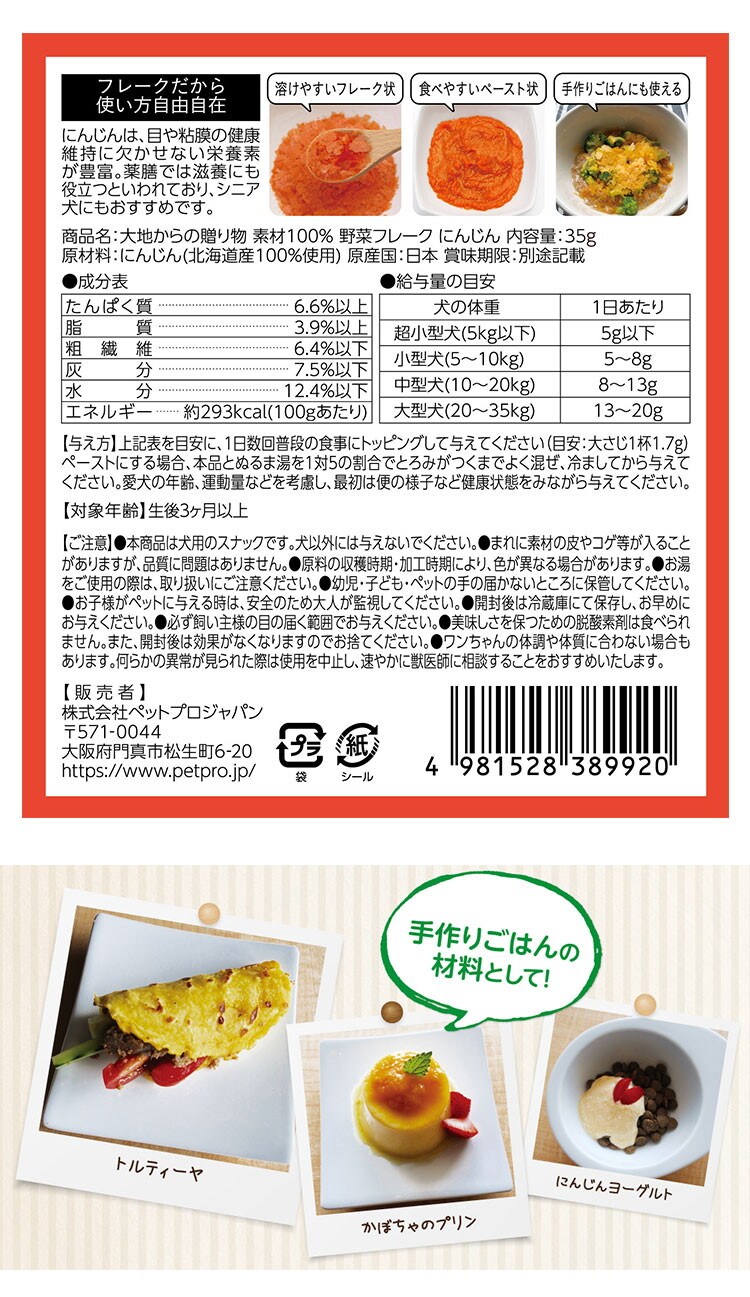【4個セット】 ペットプロ HappyDays 大地からの贈り物 素材100%野菜フレーク にんじん 35g 国産 日本製 犬用 犬 おやつ スナック ふりかけ トッピング【ポイント10倍】