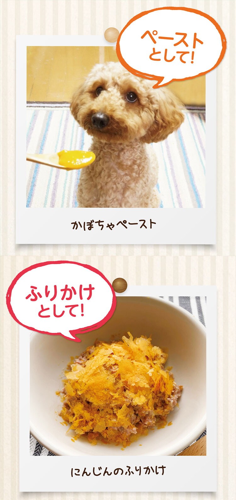 与え方:一日数回普段の食事にトッピングして与えてください(目安:大さじ1杯1.7g)。ペーストにする場合、本品とぬるま湯を1対5の割合でとろみがつくまでよく混ぜ、冷ましてから与えてください。愛犬の年齢、運動量などを考慮し、最初は便の様子など健康状態をみながら与えてください。