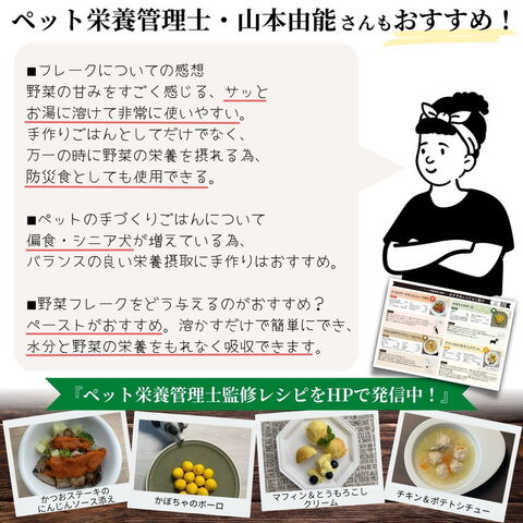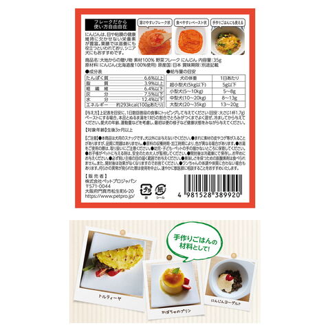 安心安全な国産(北海道産)100%のにんじんを素材のうまみと栄養そのままフレークにしました。にんじんは抗酸化作用のあるβカロテン(ビタミンA)が豊富。目や粘膜の健康維持に欠かせない栄養素も豊富です。薬膳では滋養にも役立つといわれており、シニア犬にもおすすめです。ふりかけとしていつものごはんにトッピングして、食べやすいペースト状にして、手作りごはんに、おやつになど使い方自由自在。