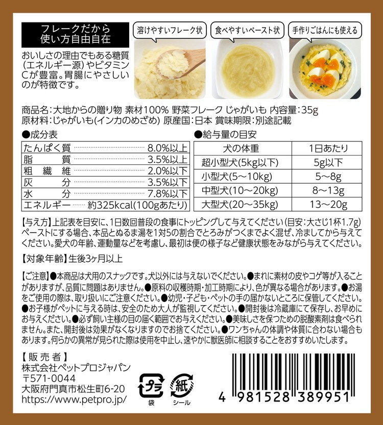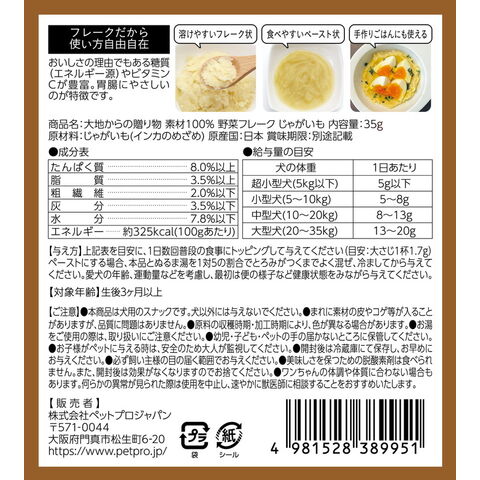 【8個セット】 ペットプロ HappyDays 大地からの贈り物 素材100%野菜フレーク じゃがいも 35g 国産 日本製 犬用 犬 おやつ スナック ふりかけ トッピング【ポイント10倍】 【送料無料】