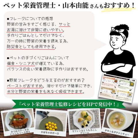 100%北海道産の甘みが強くなめらかな希少なじゃがいも(インカのめざめ)を使用した野菜フレーク。いつものごはんにトッピング、食べやすいペースト状にしたり、手作りごはんに、おやつになど使い方自由自在。ペーストにすることで水分と栄養が簡単に取れます。着色料、保存料、酸化防止剤など不使用。じゃがいもはおいしさの理由でもある糖質(エネルギー源)やビタミンCが豊富。胃腸にやさしいのが特徴です。自然の甘味が強い品種なので嗜好性が高く、食べムラのある愛犬や、食欲が落ちた愛犬にもおすすめです。