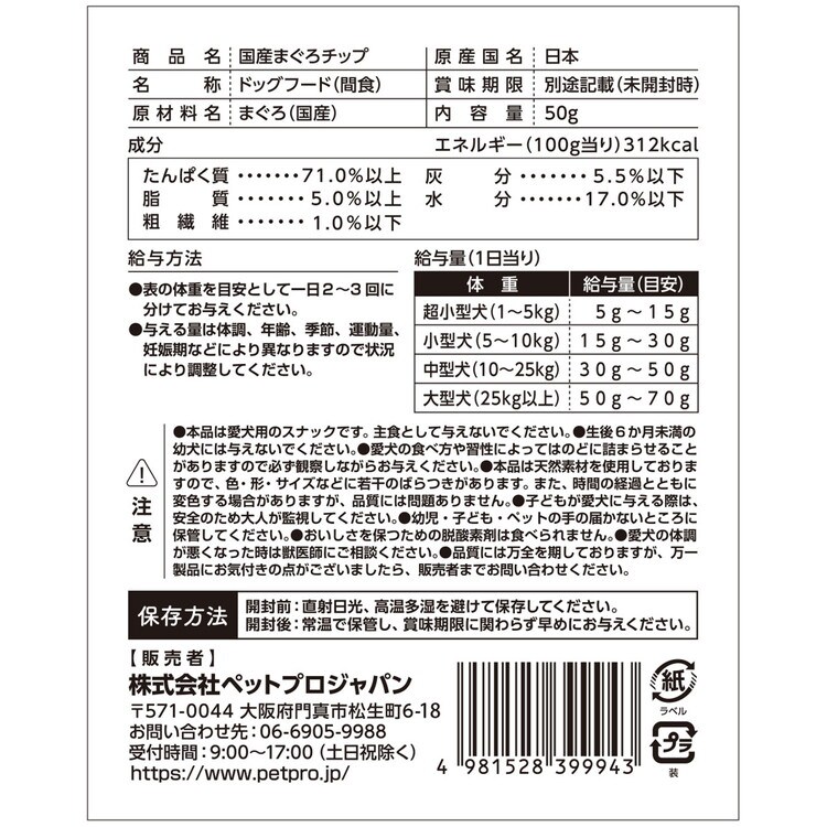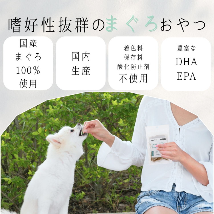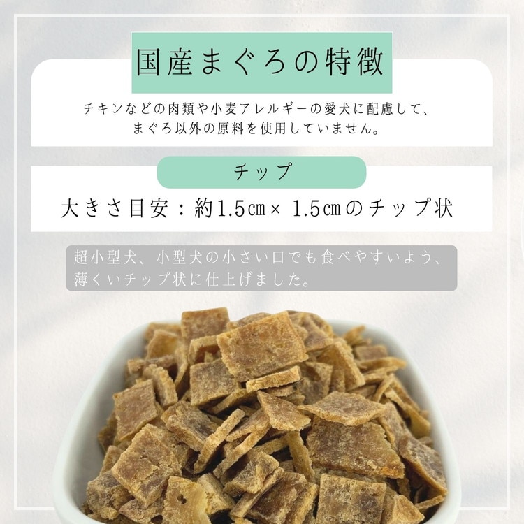 まぐろの旨みが凝縮された、嗜好性抜群の愛犬用おやつ。国産のまぐろを100%使用。着色料・保存料・酸化防止剤などの添加物不使用。チキンなどの肉類や小麦アレルギーの愛犬に配慮して、まぐろ以外の原料を使用していません。超小型犬、小型犬の小さい口でも食べやすいよう、薄くいチップ状に仕上げました。手で簡単に割れるので与えやすい形状です。