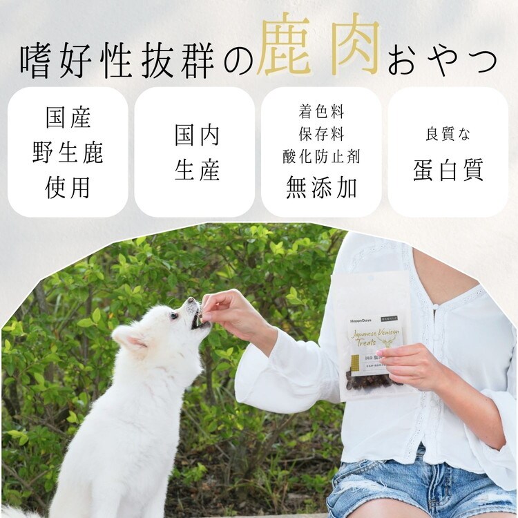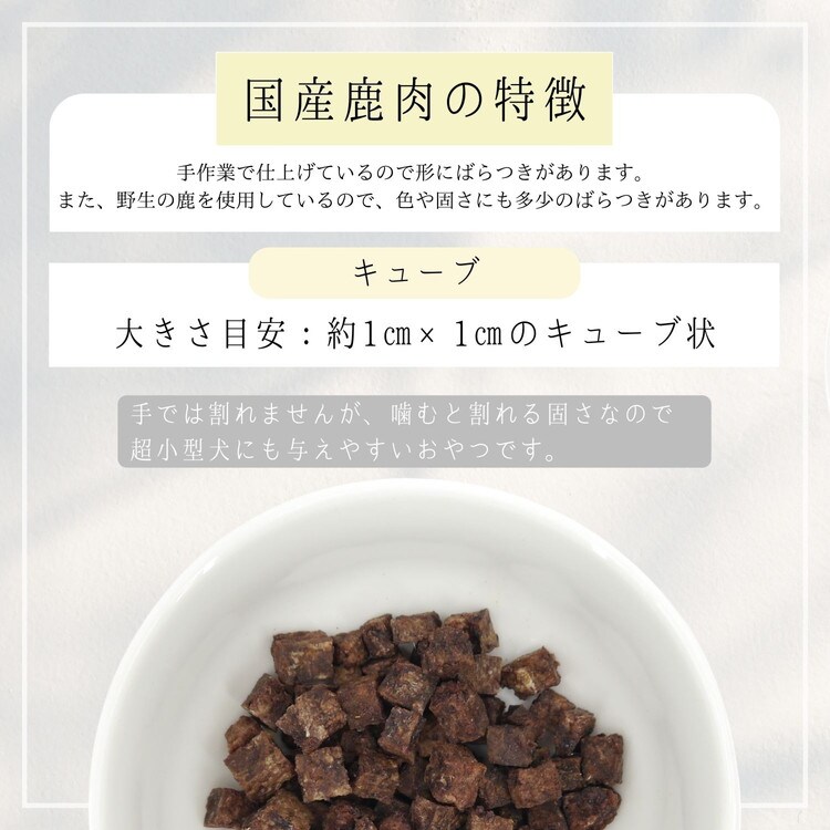 国産の鹿を丁寧に処理した犬用おやつ。着色料・保存料不使用。アレルゲンになりにくいといわれる鹿肉を使用し食物アレルギーに配慮しました。 鹿肉には不飽和脂肪酸(オメガ3・6脂肪酸)やビタミンB群が含まれています。チワワ、ヨーキーなどお口の小さい超小型犬も食べやすいサイズです。