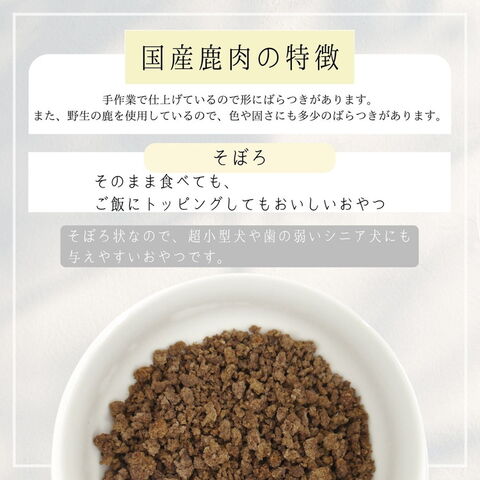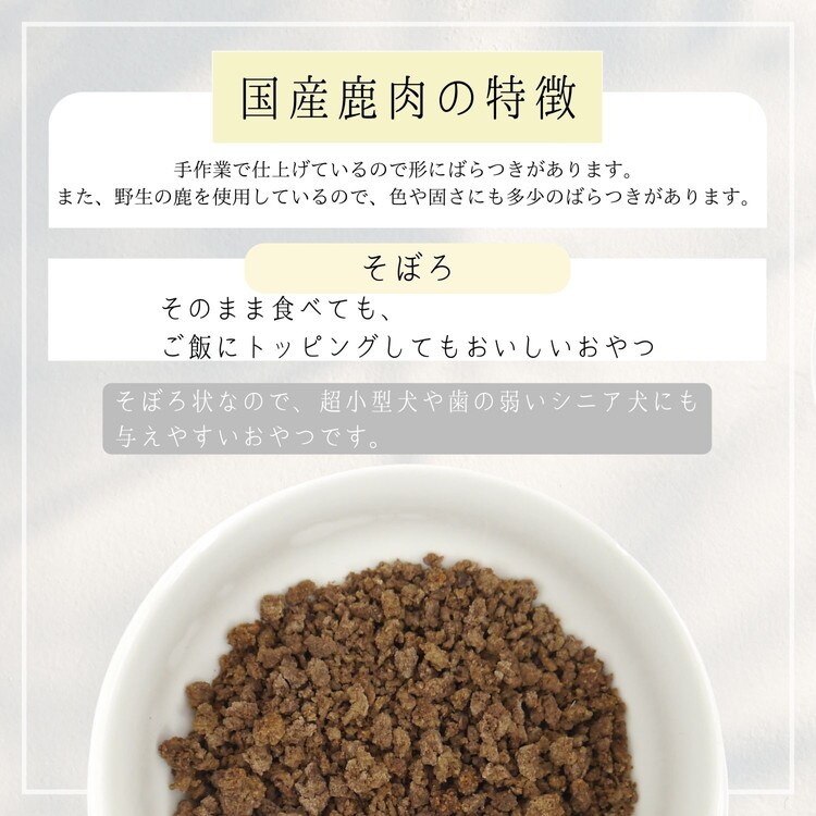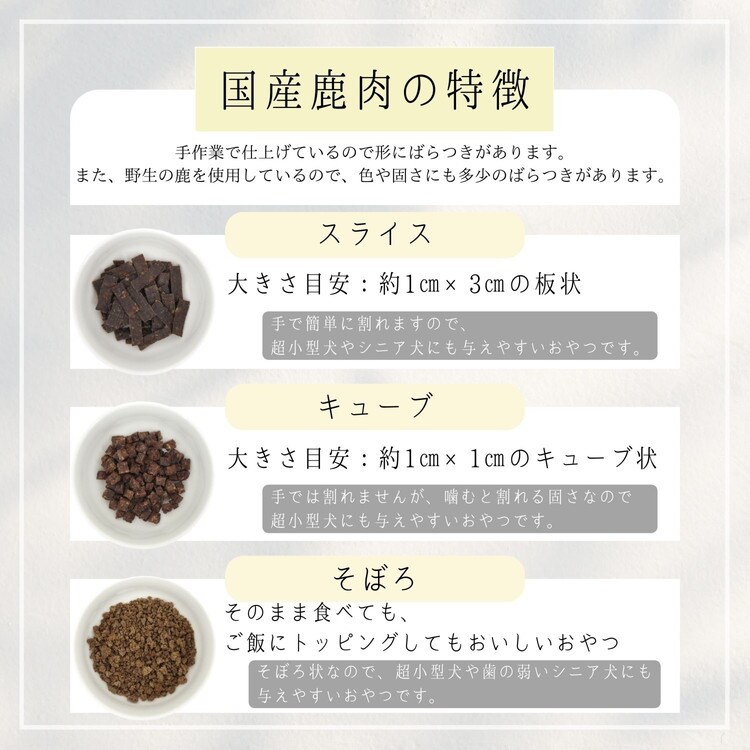 国産の鹿を丁寧に処理した犬用おやつ。着色料・保存料不使用。アレルゲンになりにくいといわれる鹿肉を使用し食物アレルギーに配慮しました。 鹿肉には不飽和脂肪酸(オメガ3・6脂肪酸)やビタミンB群が含まれています。チワワ、ヨーキーなどお口の小さい超小型犬も食べやすいサイズです。
