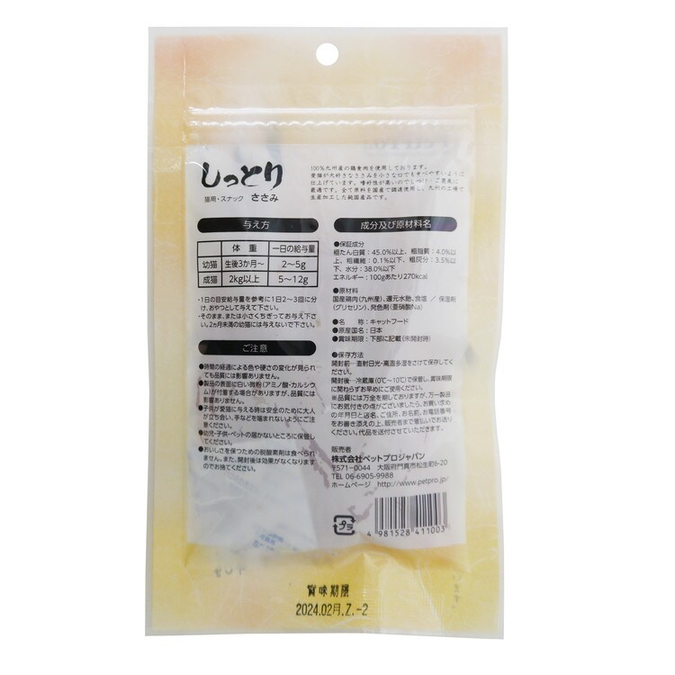 100%九州産の鶏食肉を使用しています。愛猫が大好きなささみを小さな口でも食べやすい薄切りに仕上げています。猫の小さな体を考え食品添加物は最小限に抑えています。九州の工場で生産加工しております。嗜好性が高いのでしつけやご褒美に最適です。