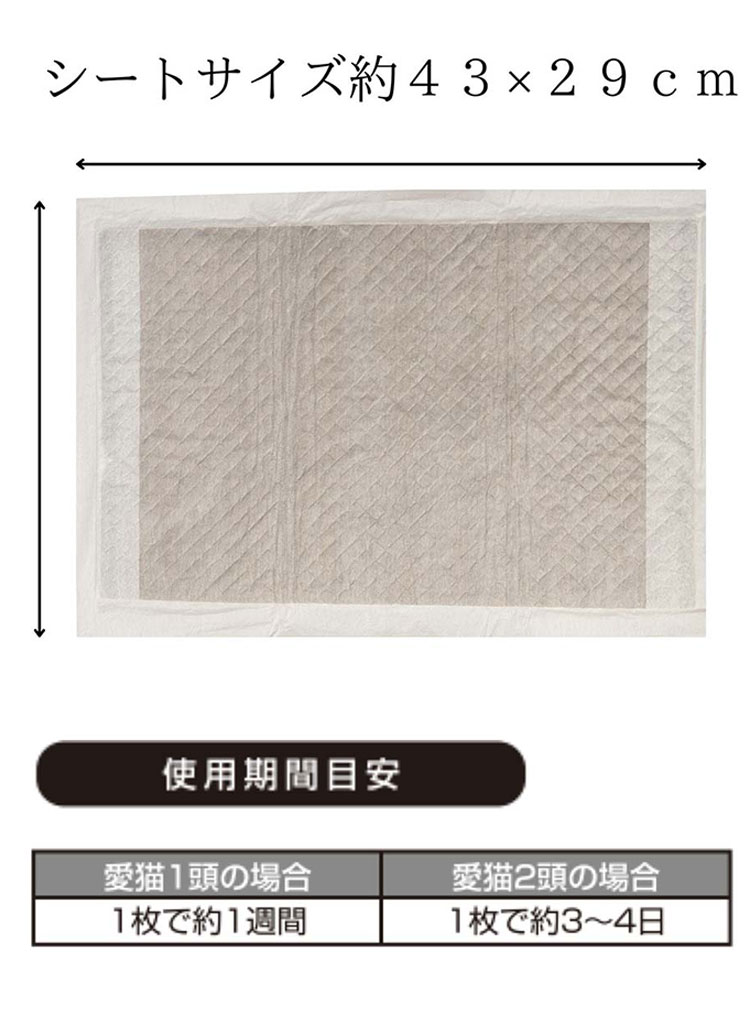 炭入りシートがニオイ成分を吸着し、強力に消臭するシステムトイレ用シートです。1枚で愛猫1頭のオシッコ約1週間をしっかり吸収*。1週間に1回の取り替えでお手入れ簡単です。 *愛猫1頭(体重8kgまで)の使用時。ウンチをした場合は早く取り除いてください。