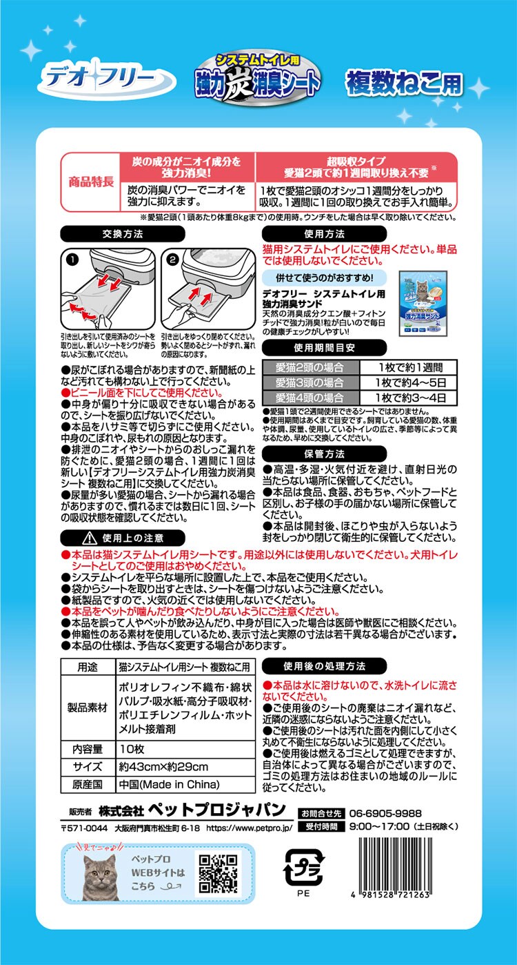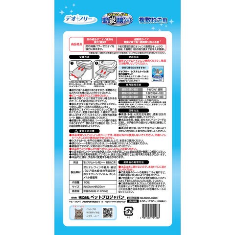 【4個セット】 ペットプロ デオフリー 強力消臭シート 複数ねこ用 10枚 各社共通 システムトイレ用シート 猫シート 猫用シート 猫用トイレシート シーツ PetPro【送料無料】