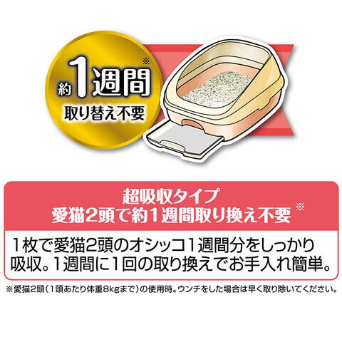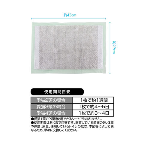 炭入りシートがニオイ成分を吸着し、強力に消臭する複数ねこ用システムトイレシートです。1枚で愛猫2頭のオシッコ約1週間分をしっかり吸収*。1週間に1回の取り替えでお手入れが簡単にできます。*愛猫2頭(1頭あたり体重8kgまで)の使用時。ウンチをした場合は早く取り除いてください。尿量の多い愛猫にもおすすめです。