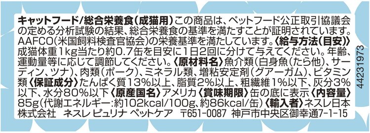 魚介類(白身魚(たら他)、サーディン、ツナ)、肉類(ポーク)、ミネラル類、増粘安定剤(グアーガム)、ビタミン類