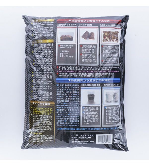 ・本品はクワガタ虫の成虫管理、産卵のセット、幼虫の育成、サナギの管理などの飼育用マットです。他の目的では使用しないでください。