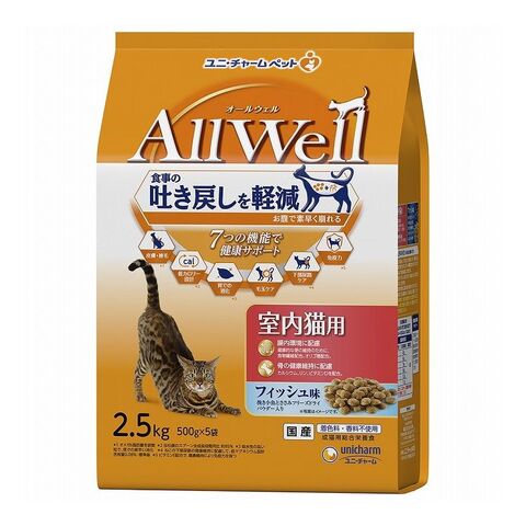 【2個セット】 ユニチャーム AllWell 室内猫用 フィッシュ味挽き小魚とささみフリーズドライパウダー入り 2.5kg (500g×5袋)【ポイント10倍】 【送料無料】