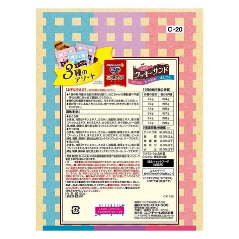 小麦粉、肉類(チキンエキス、ささみ)、油脂類、酵母エキス、魚介類(フィッシュエキス、まぐろエキス、かつおエキス、かつお節)、ビール酵母、糖類、調味料、酸化防止剤(ミックストコフェロール、ハーブエキス)