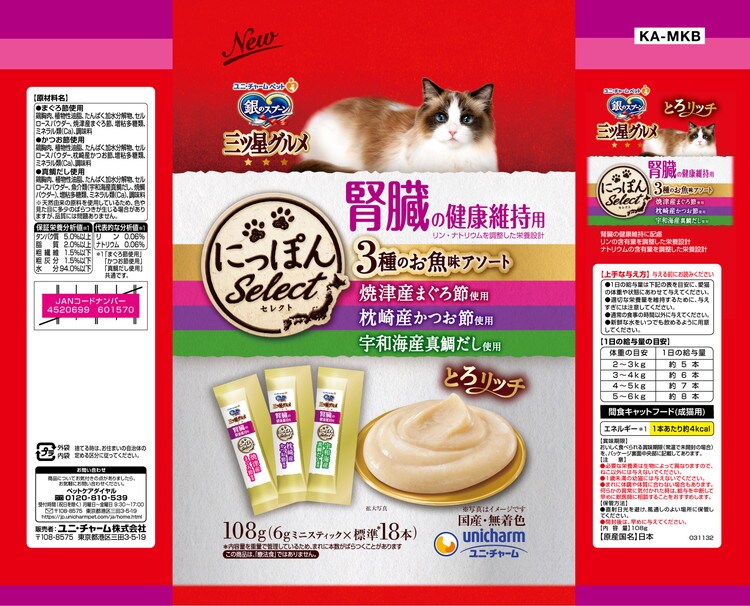 【8個セット】 ユニチャーム 銀のスプーン三ツ星グルメ にっぽんSelect とろリッチ 腎臓の健康維持用 3種のアソート まぐろ節&かつお節&真鯛だし 108g【ポイント10倍】 【送料無料】