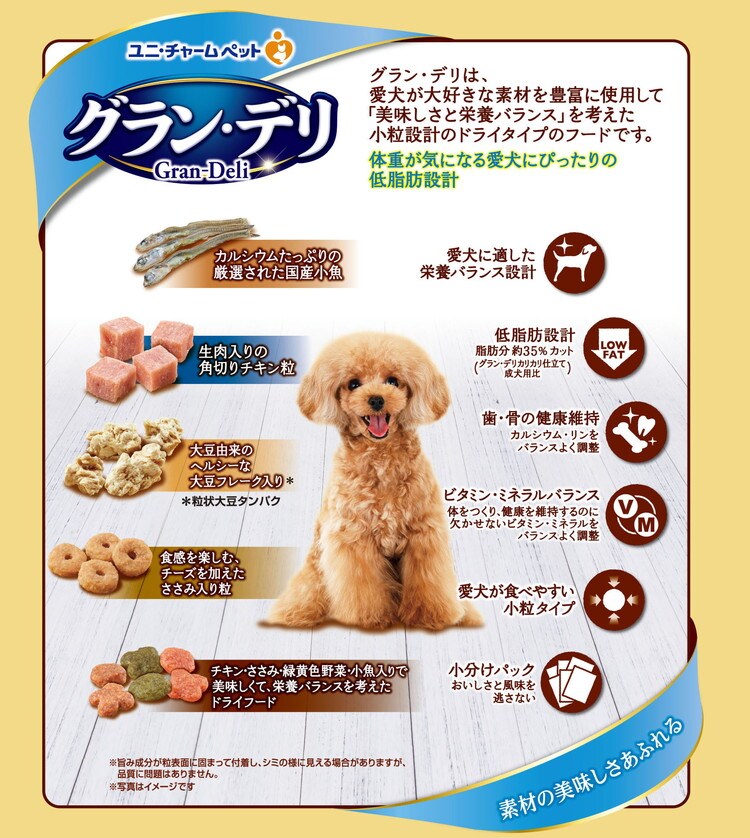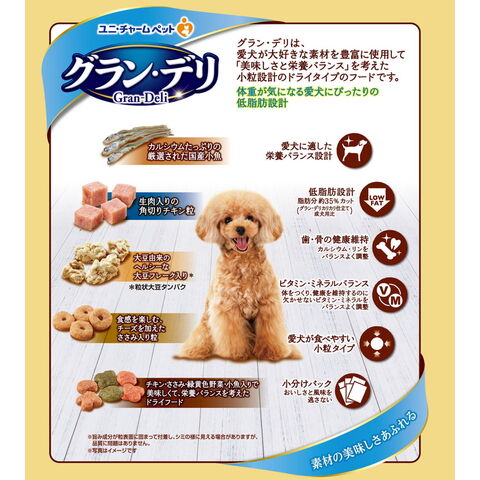 グラン・デリは、愛犬が大好きな素材を豊富に使用して「美味しさと栄養バランス」を考えた小粒設計のドライタイプのフードです。体重が気になる愛犬にぴったりの低脂肪設計