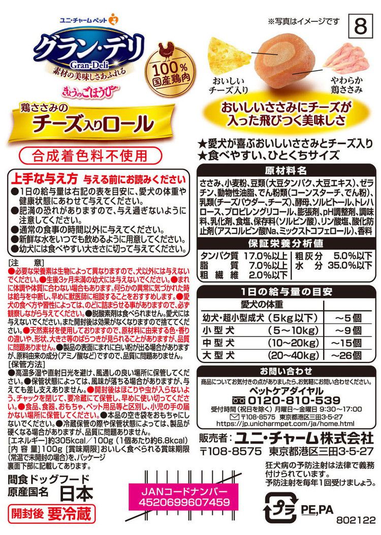 【4個セット】 ユニチャーム グラン・デリ きょうのごほうび 鶏ささみのチーズ入りロール 100g【ポイント10倍】 【送料無料】