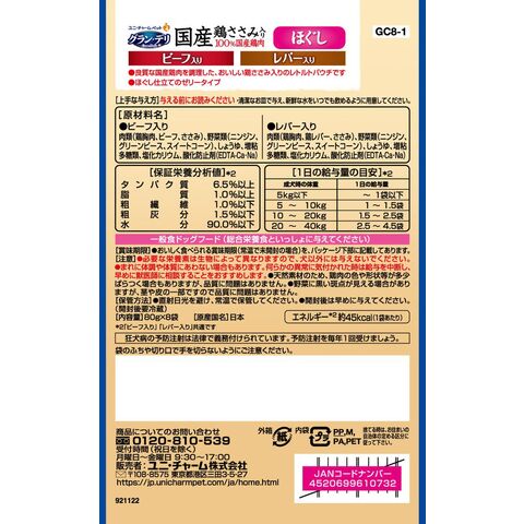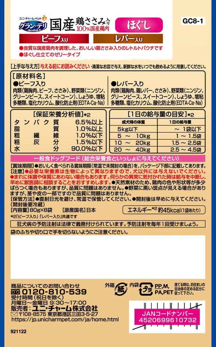 【2個セット】 ユニチャーム グラン・デリ 国産鶏ささみパウチ ほぐし 成犬用8袋パック ビーフ入り&レバー入り 80g×8袋【ポイント10倍】