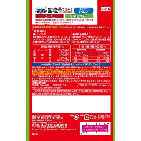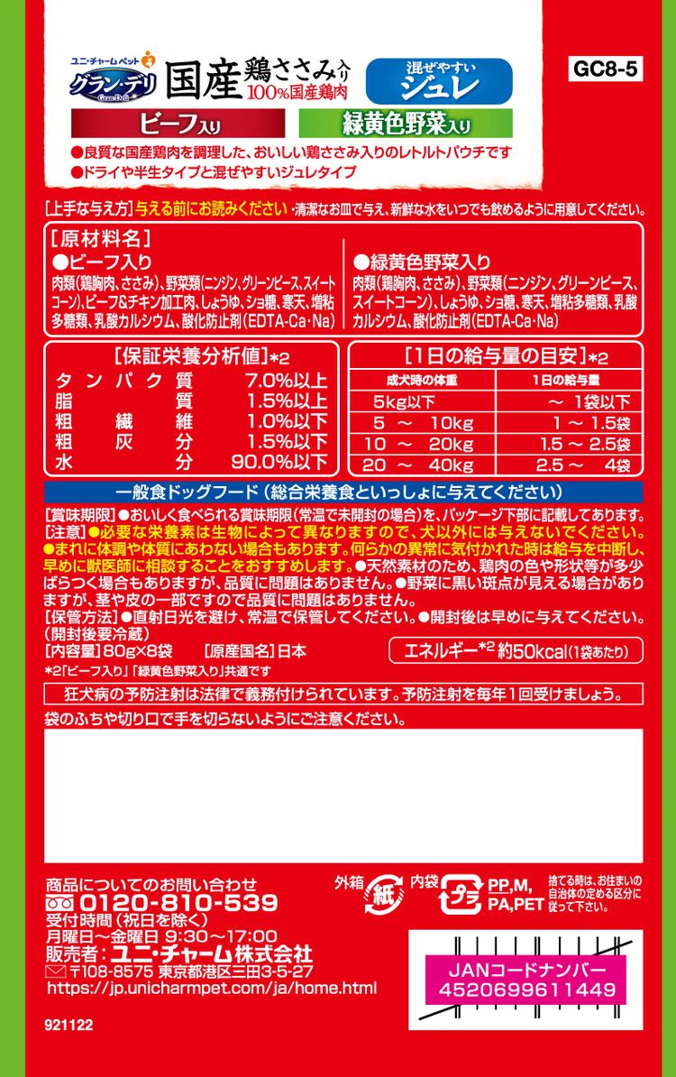 【4個セット】 ユニチャーム グラン・デリ 国産鶏ささみパウチ ジュレ 成犬用8袋パック ビーフ入り&緑黄色野菜入り 80g×8袋【ポイント10倍】 【送料無料】