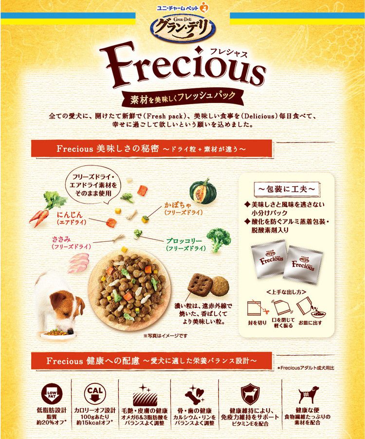 100gあたり約15kcalオフ* ※フレシャス アダルト 成犬用比