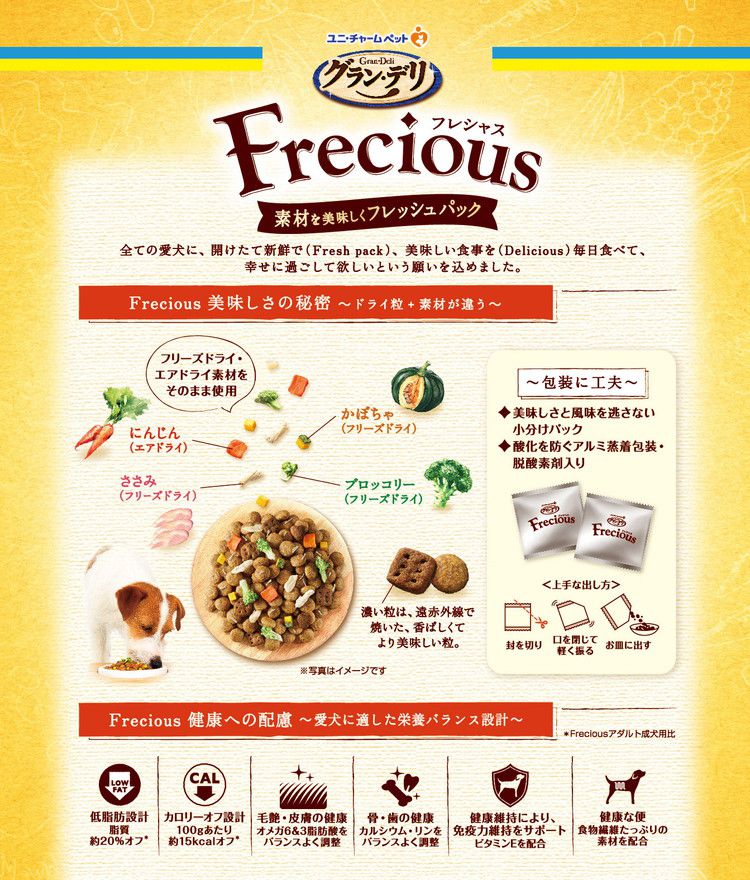 100gあたり約15kcalオフ* ※フレシャス アダルト 成犬用比