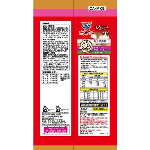 鶏胸肉、魚介類(かつお、枕崎産かつお節)、植物性油脂、調味料、増粘多糖類、ミネラル類(Ca、Cl、Co、Cu、Fe、l、K、Mn、P、Zn)、ビタミン類(A、B1、B2、B6、B12、C、D、E、K、コリン、ナイアシン、パントテン酸、ビオチン、葉酸)、アミノ酸類(タウリン)