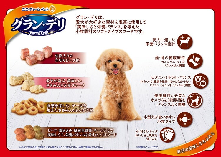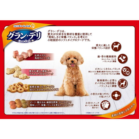 グラン・デリは、愛犬が大好きな素材を豊富に使用して「美味しさと栄養バランス」を考えた小粒設計のドライタイプのフードです。