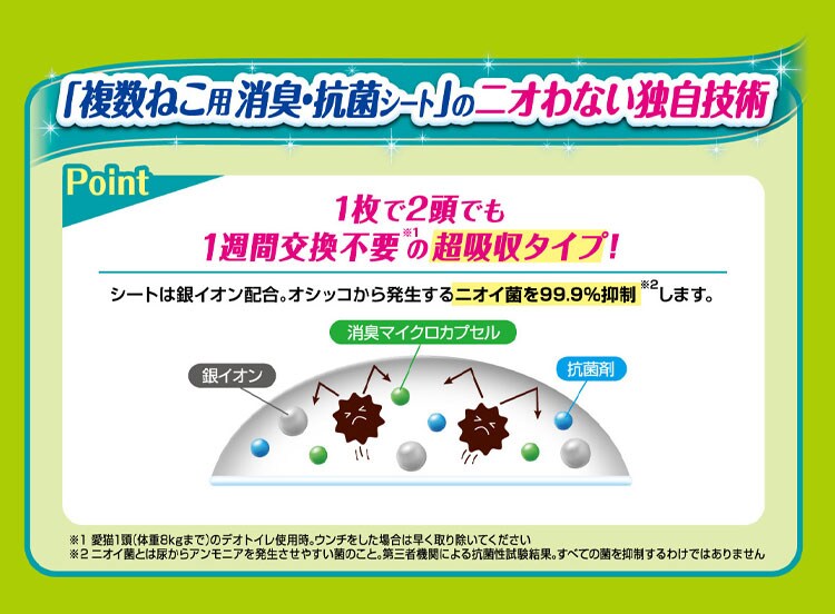 ・抗菌剤入りなので、アンモニア臭(悪臭)の発生を防ぎます。ねこ専用の消臭マイクロカプセル配合で強力消臭