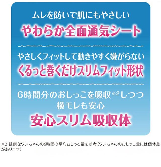 マーキング・そそうに安心。お出かけ先でもおうちでも!「やわらか全面通気シート」で、ムレを防いで肌にもやさしい。「くるっと巻くだけスリムフィット形状」で、動きやすく&嫌がらない。「安心スリム吸収体」で、6時間分のおしっこを吸収※健康なワンちゃんの6時間の平均おしっこ量を参考(ワンちゃんのおしっこ量には個体差があります)